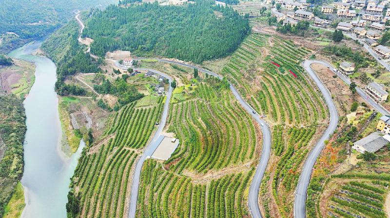 赤水河畔,赤水路蜿蜒在柑橘园中。 泸州观察 郭荞璐 摄