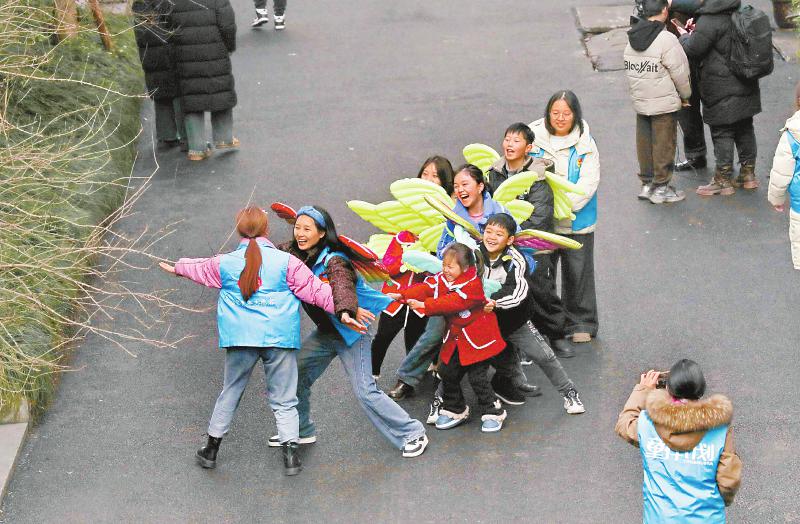 2月10日,志愿者在安置点和小朋友一起做游戏。 庄歌尔 摄(C视觉)
