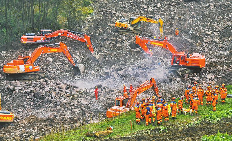 2月10日,在筠连县“2·8”山体滑坡灾害救援现场,各路救援重型机械在滑坡体上有序作业。 四川日报全媒体记者 华小峰 摄