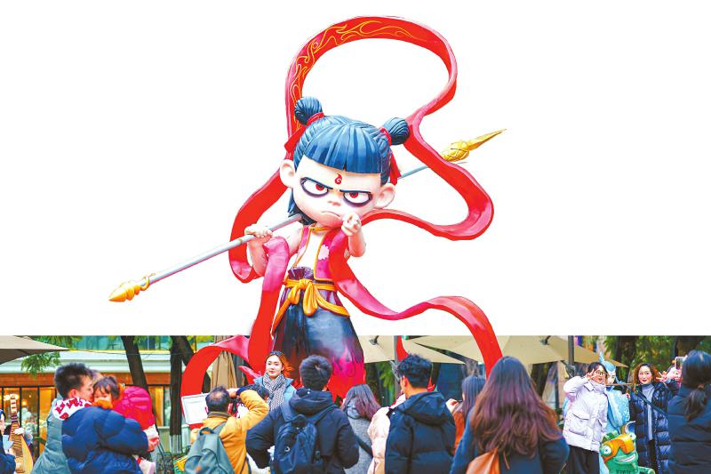 成都双子塔哪吒雕塑,吸引不少市民前来打卡。 袁义明 摄(C视觉)