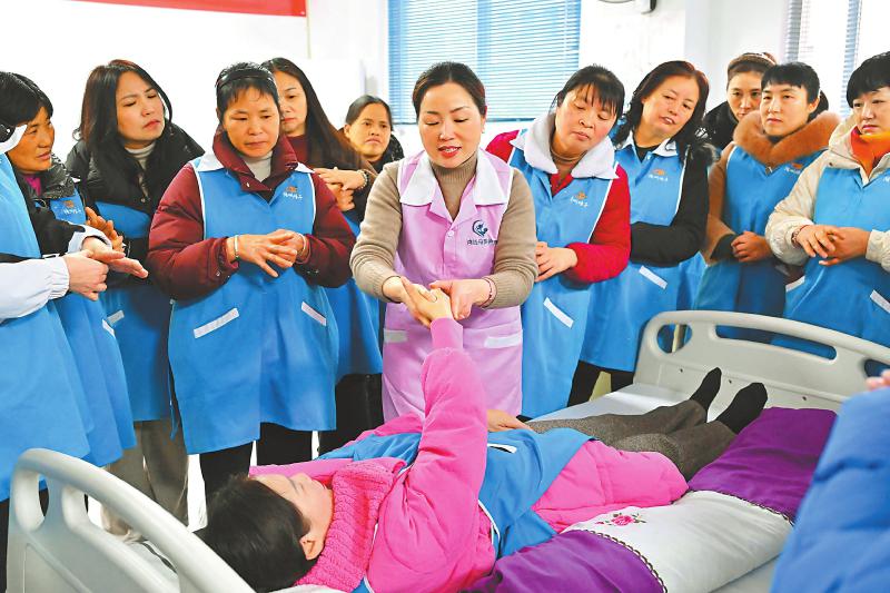 2月19日,在眉山市仁寿鸿钰职业培训学校,老师正向学员示范养老护理操作技能。近年来,眉山市仁寿县人力资源和社会保障局结合市场需求,免费为有就业、创业需求的返乡农民工、下岗人员等群体,提供养老护理、电子商务、餐饮烹饪等职业技能培训,助其提升就业技能,拓宽就业渠道。 潘帅 摄(C视觉)