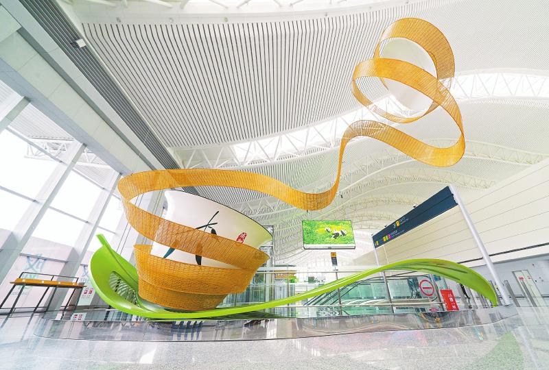 成都双流国际机场1号航站楼的盖碗茶艺术装置。刘婷 摄(C视觉)