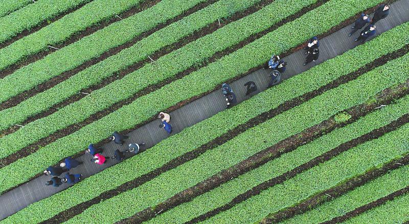 2月22日,以“品味中国春天的第一杯茶——纳溪特早茶”为主题的四川省第十二届茶叶开采活动周启动仪式在泸州市纳溪区中国特早茶城举行,吸引来自全国各地的专家学者、茶商以及游客等参加。图为参加活动的茶企茶商以及游客在护国镇梅岭村茶叶主题公园里参观。廖胜春 摄(C视觉)