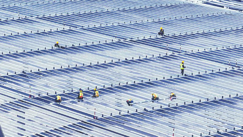 项目建设现场,工人们身系安全绳,爬上钢梁进行屋顶结构施工。 施皓文 摄