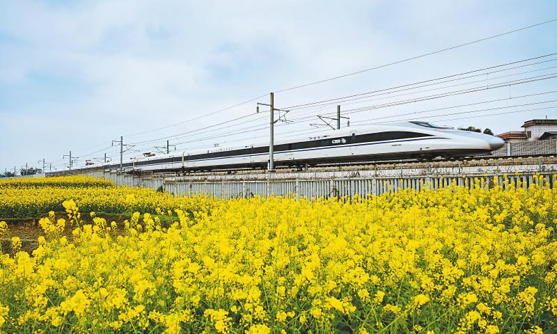 春回大地,泸州市各地油菜花陆续盛开。2月22日,动车组列车行驶在泸州市江阳区通滩镇平丰村境内的渝昆高铁线上。列车穿行油菜花间,构成一幅流动的春天画卷。 刘学懿 摄