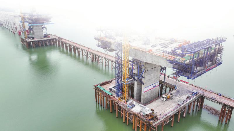 2月21日,在阆营高速公路控制性工程嘉陵江特大桥建设工地,正在进行主桥悬浇梁和主塔施工。王玉贵 摄(C视觉)