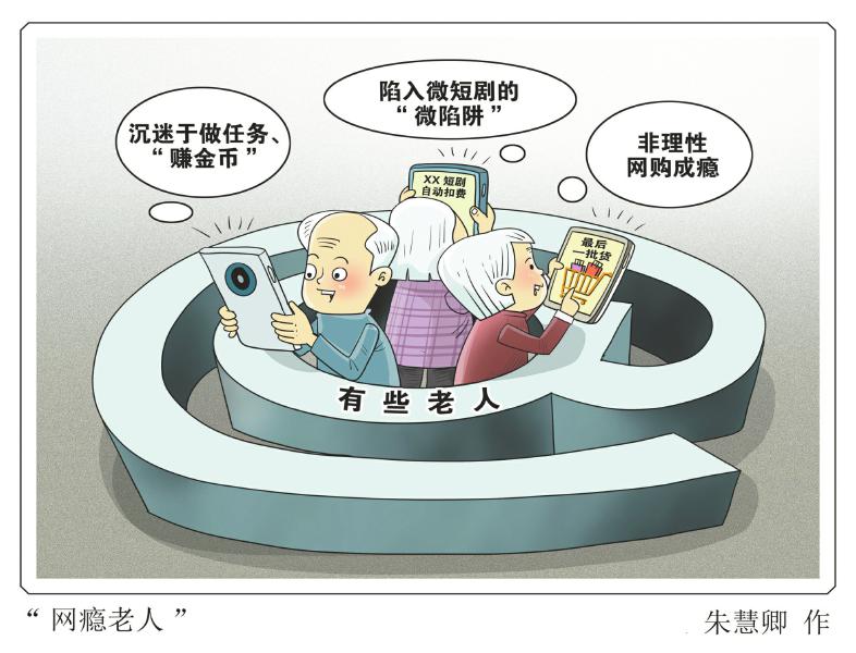 最近,许多网友在社交平台上的“网瘾老人”话题中认领起“同款爸妈”:有的沉迷“赚金币”,上网8小时赚回2元钱;有的茶饭不思,刷短视频、看微短剧、听小说直至深夜;还有的不信儿女信主播,跟风下单各种劣质保健品……在良莠不齐的电子信息“围猎”下,老年人“触网”背后既有精彩也有陷阱。 朱慧卿 图
