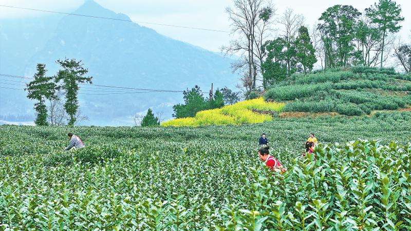 近日,位于宜宾市屏山县中都镇新权村的有机茶叶示范基地内,茶农在采收早茶。 雷鲤溶 摄