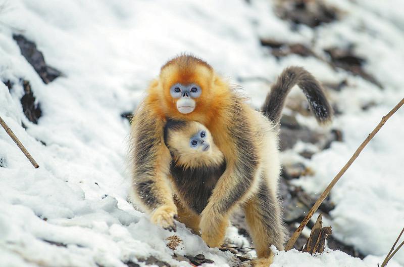 2月24日,四川北部多地迎来降雪。绵阳市平武县黄羊关藏族乡的川金丝猴在雪中觅食嬉闹,萌态十足惹人爱。 田明章 摄(C视觉)