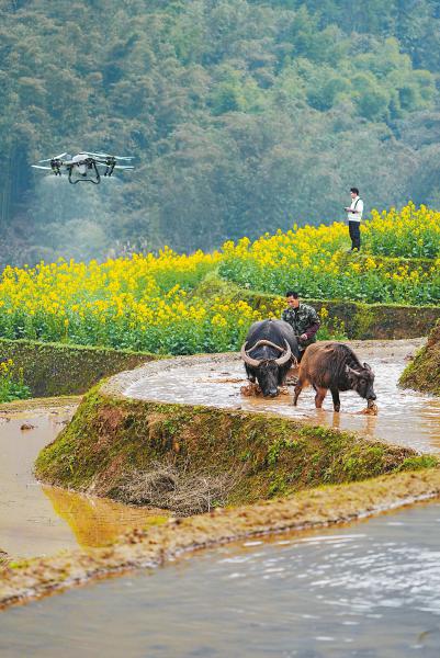 2月28日,在泸州市叙永县大石镇旺龙村,一位村民正在使用耕牛进行春耕,而他身后,一台植保无人机正在对油菜地进行病虫害防治。