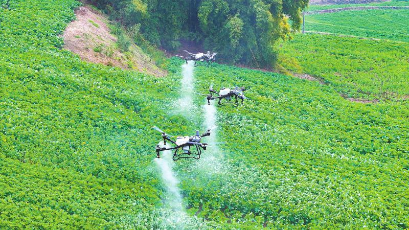 近日,威远县严陵镇食丰村冠禾种植家庭农场的油菜田上空,3台植保无人机腾空而起,将雾化药液均匀洒向田间。今年,该县投入40余架无人机组成“空中卫士”,为13.4万亩油菜实施统防统治,以科技助力春耕。 威远县委宣传部供图