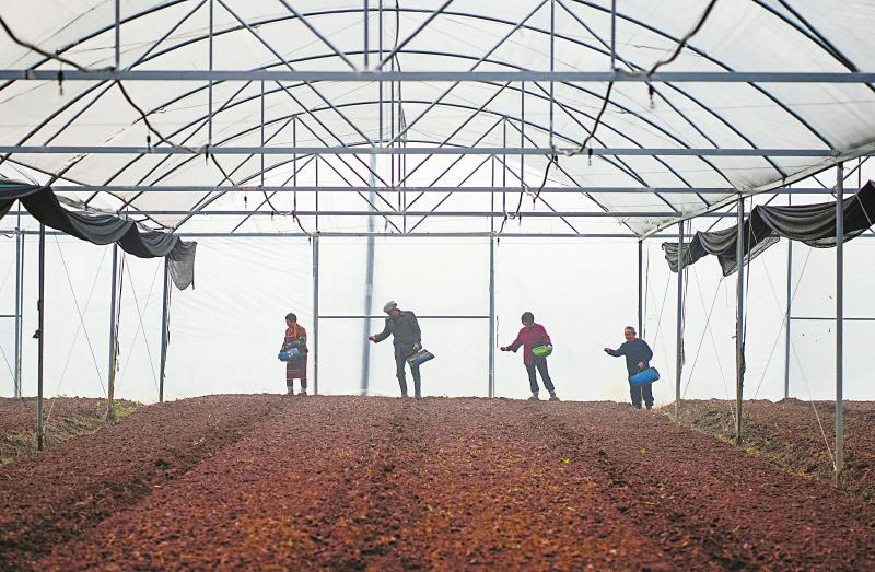 3月2日,在泸州市泸县潮河镇伏鱼村的泸县爽丰种养殖专业合作社育秧大棚中,村民正在进行水稻的旱育秧。
