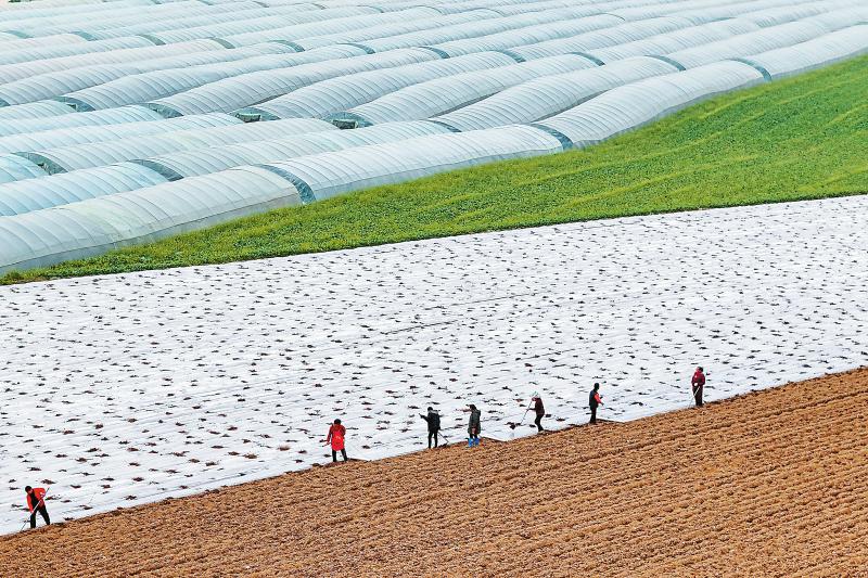 2月27日,在南充市蓬安县中坝社区蔬菜种植基地,农户们正在地里覆盖农膜,远处的果蔬轮作大棚排列整齐,该蔬菜基地实现了种植的“无缝衔接”。