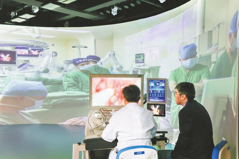 陶磊教授正在操控经口手术机器人系统进行手术。 成都市科技局供图