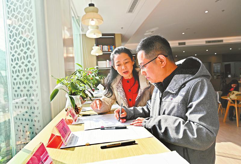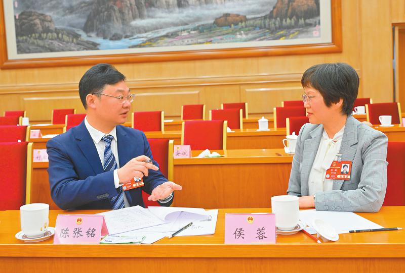 3月4日,陈张铭代表(左)和侯蓉代表就营造清朗网络空间,呵护青少年健康成长进行交流。 四川日报全媒体记者 欧阳杰 摄