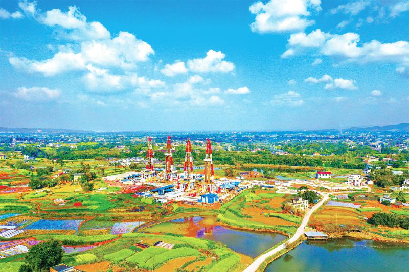四川盆地的天然气钻井平台。