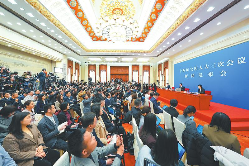3月4日,十四届全国人大三次会议在北京人民大会堂举行新闻发布会。大会发言人娄勤俭就大会议程和人大工作相关问题回答中外记者提问。新华社记者刘大伟 摄