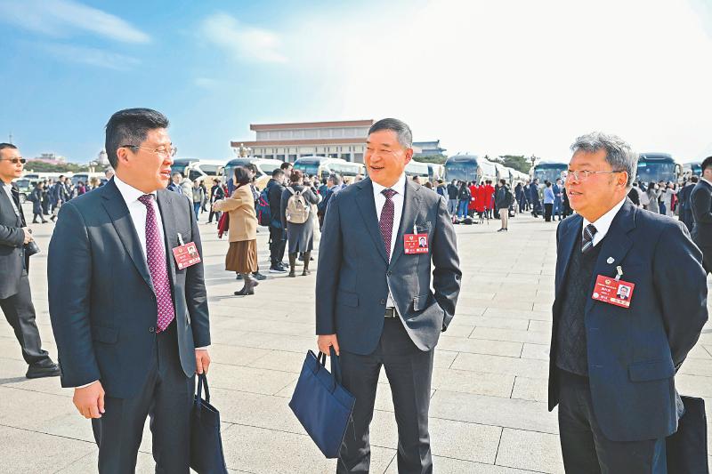 3月4日,全国政协十四届三次会议开幕会前,全国政协委员郭代军、林罡、周仲荣(从左至右)进行交流。 四川日报全媒体记者 杨树 摄
