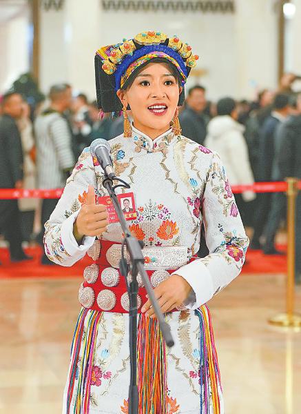 3月5日,全国人大代表格西王姆在首场“代表通道”集中采访活动上接受采访。新华社记者 刘大伟 摄