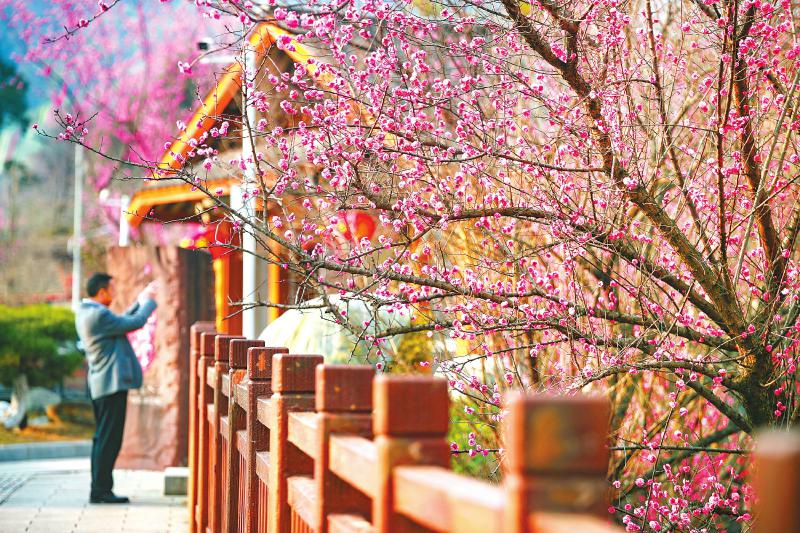 初春时节,位于雅安市名山区的十里梅香·茶源小圳和梅花谷·精灵乐园内外,一树树梅花竞相开放,生机勃勃,吸引不少市民和游客寻香而来。图为近日,游客在十里梅香·茶源小圳外用手机拍摄记录早春美景。 雅安观察 黄刚 摄