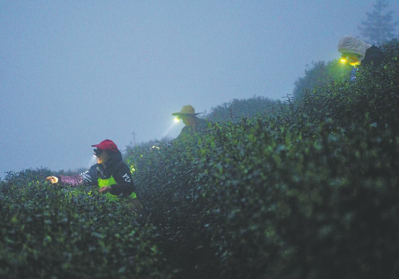 3月13日,泸州市纳溪区打古镇普照村的茶农在头灯的帮助下“掐尖尖”。