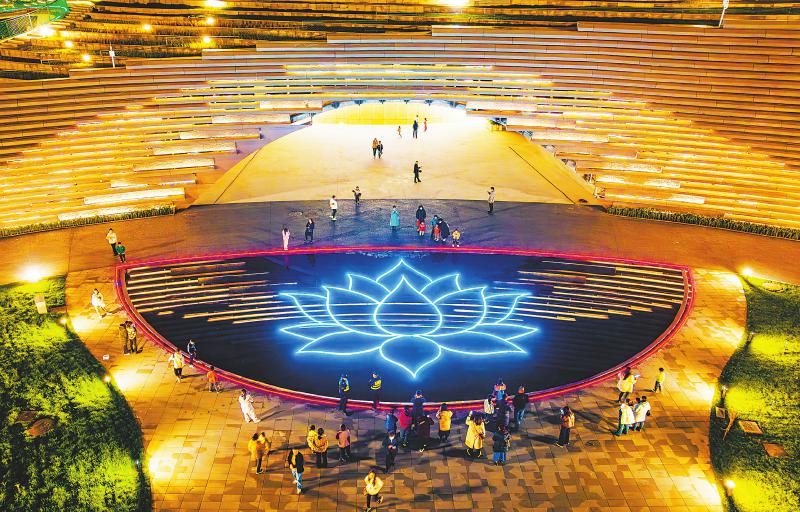3月15日晚,资阳市安岳县安岳石窟数字展示中心整体试灯。璀璨的灯光下,造型别致的建筑吸引市民驻足。安岳石窟数字展示中心以两座石窟数字展示馆、一座3D8K球幕影院、一座Boxfilm沉浸式电影空间影院为依托,打造石窟文化旅游体验新亮点。 张天富 摄(C视觉)