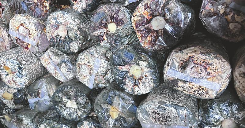 冯先生家中的菌包约一半没出菇,部分袋子出现了绿色霉菌。 封面新闻记者 赵奕 摄