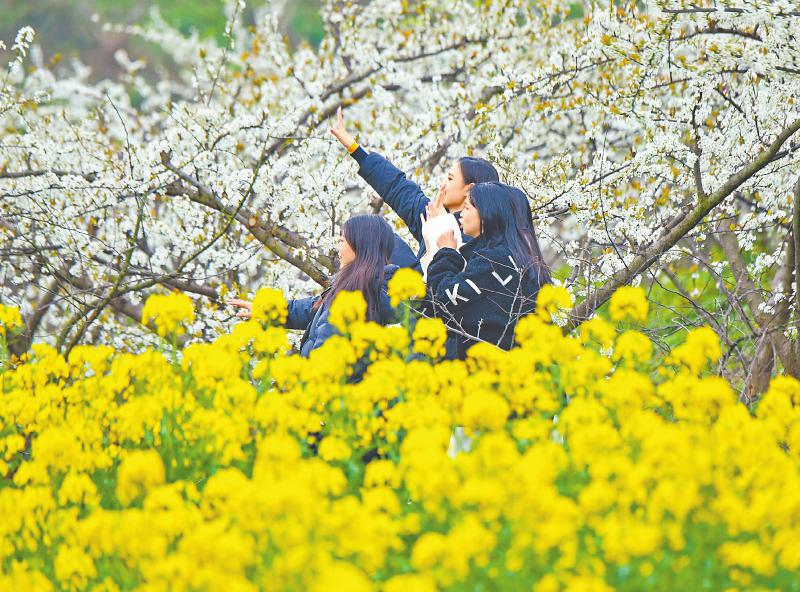 3月17日,游客在南充市蓬安县新园乡宽敞沟村的李花林里赏花拍照。 汪泽民 摄(C视觉)