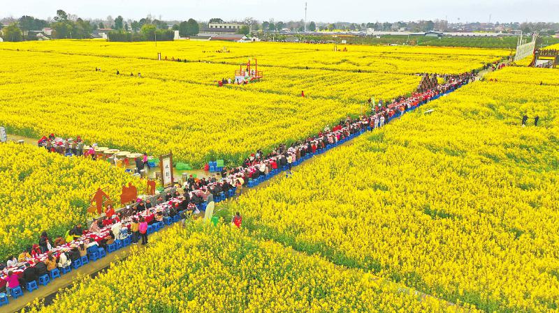 3月14日,游客在德阳绵竹市什地镇五方村的油菜花田享用长桌宴火锅。 王平 摄(C视觉)