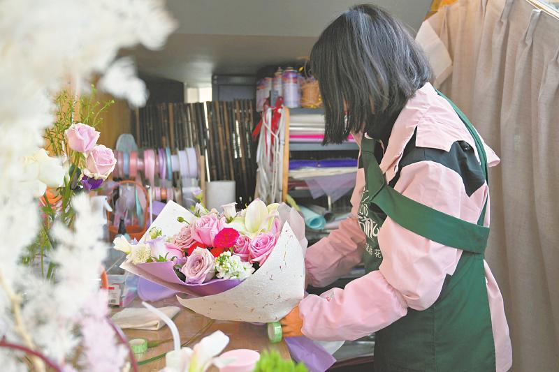 复合型花店的花艺师正在包装花束。