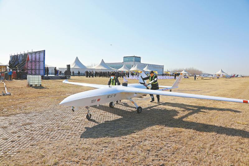 3月18日上午,长航时大载重无人运输机“宝云号”在河北衡水成功首飞。“宝云号”是由衡水桃城机场完全自主研制的长航时大载重无人运输机,最长航时26个小时,比现有续航10小时左右的同类机型续航能力增长超一倍。 新华社发(陈连胜 摄)