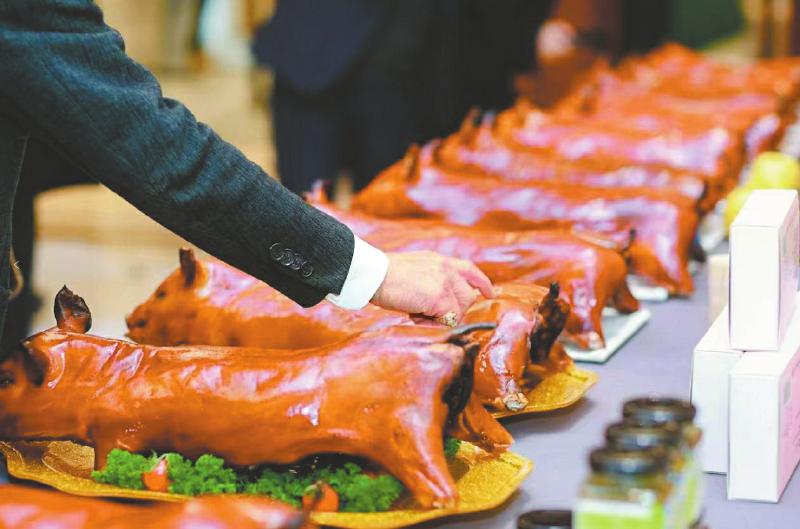 发车仪式现场烤制的藏香乳猪。 四川睿禾亮农业科技发展有限公司供图