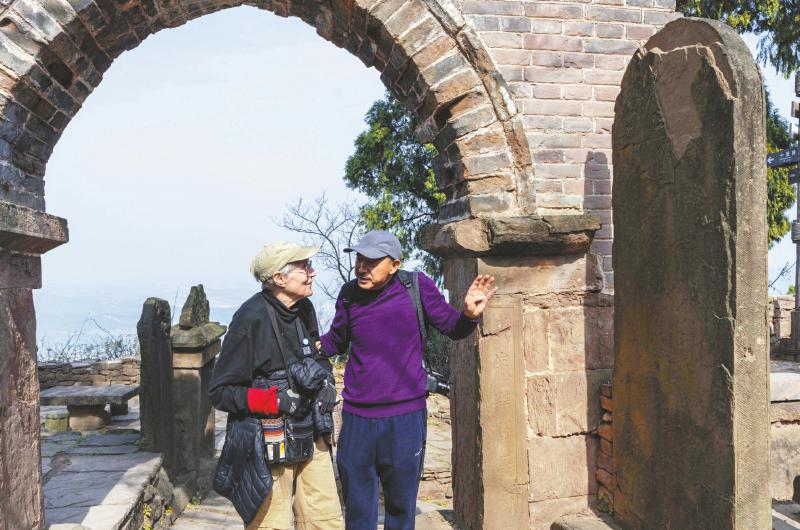 3月19日,贾和普(左)在广元市昭化区古蜀道与朋友陈洋交流。四川日报全媒体记者 何海洋 摄