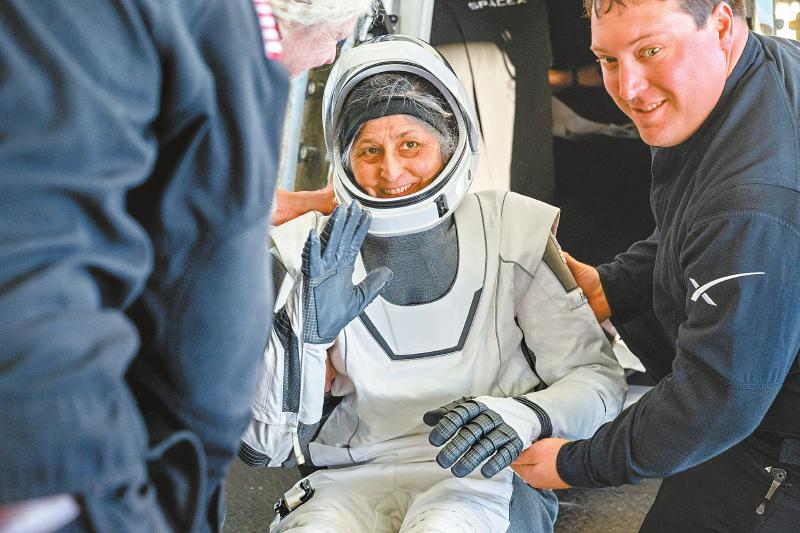 3月18日,在美国佛罗里达州附近海域,美国宇航员威廉姆斯(中)在工作人员的帮助下出舱。