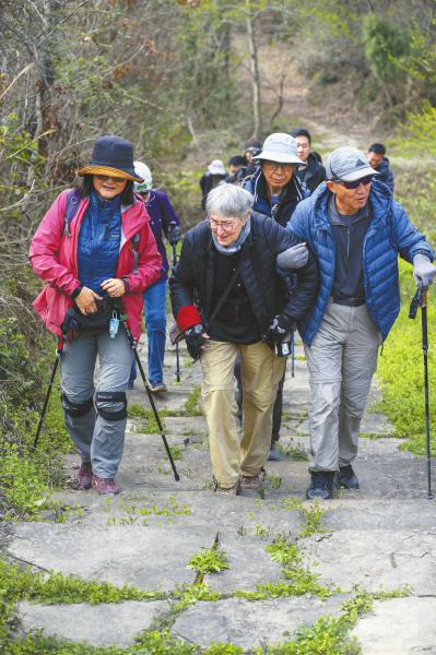 3月19日,贾和普(前中)和朋友行走在古蜀道上。 四川日报全媒体记者 何海洋 摄