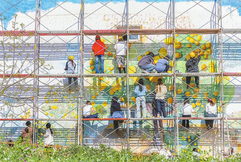 3月24日,在资阳临空经济区红碑村,四川音乐学院临空经济区校区美术学院的同学们为当地农房进行墙绘创作。 张天富 摄(C视觉)