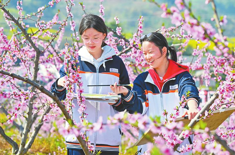 3月24日,在眉山仁寿县始建镇杏花村桃花园,仁寿县第一中学校北校区高二美术班的学生用画笔感受春天的气息。 潘帅 摄(C视觉)