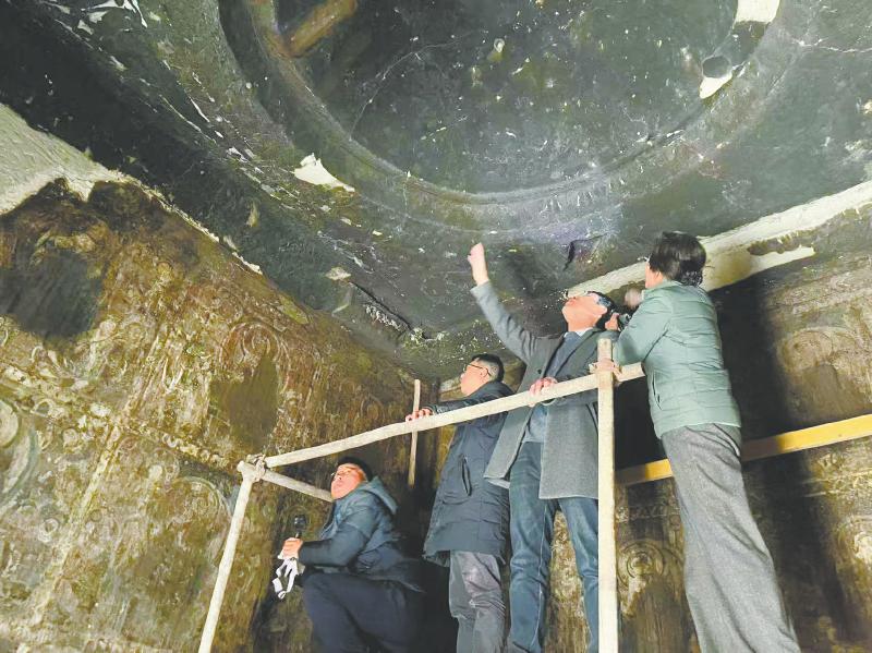 胡旻(左二)等人在克孜尔石窟内探查。 受访者供图