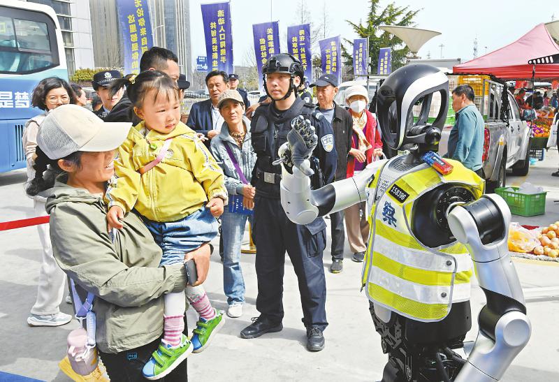 3月24日,一台具备引导和语音交互功能的警用机器人亮相青岛市流动人口服务管理宣传周启动仪式,与现场群众互动,回答人们咨询的问题。图为警用机器人与群众互动。 新华社记者 李紫恒 摄