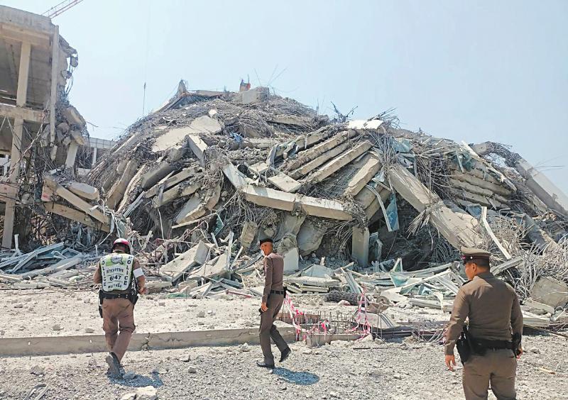 泰国 这是3月28日在泰国曼谷拍摄的倒塌的建筑(手机拍摄)。据救援现场指挥中心最新数据,地震引发的曼谷高楼倒塌已致5人死亡、9人受伤,目前仍有117人失踪。 新华社发(拉亨 摄)