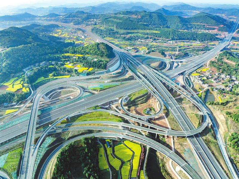 俯瞰G5京昆高速公路绵阳至成都段扩容项目德阳新中枢纽互通。新中枢纽互通既是个“高接高”转换枢纽互通,也是个落地互通,连接了成都都市圈环线高速公路和国道350线,主线长达2.5公里,有匝道21条、桥梁28座,建设规模远远超过一般的枢纽互通。该互通已于今年1月1日正式通车,为区域交通提供了便利。 李涛 摄(C视觉)