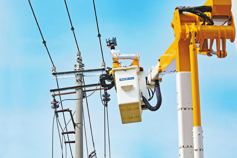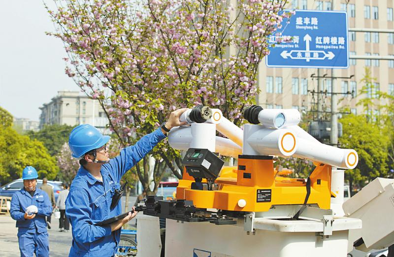4月9日,在成都市武侯区红牌楼街道,国网成都供电公司工作人员使用机器人开展带电作业,对10千伏楼灵线太平村支12号杆加装接地环(右图)。机器人带电作业完成后,工作人员检查设备状况(上图)。 陈红梅 摄(C视觉)