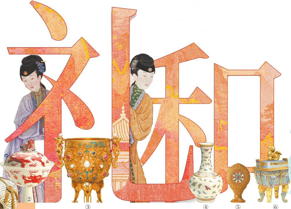 ②乾隆款矾红龙纹天鸡高足盖碗(沈阳故宫博物院藏)。③乾隆款金瓯永固杯(故宫博物院藏)。④光绪款粉彩百蝶瓶(沈阳故宫博物院藏)。⑤乾隆款粉彩金地瓷轮(沈阳故宫博物院藏)。⑥掐丝珐琅兽面出戟双耳四足盖炉(沈阳故宫博物院藏)。