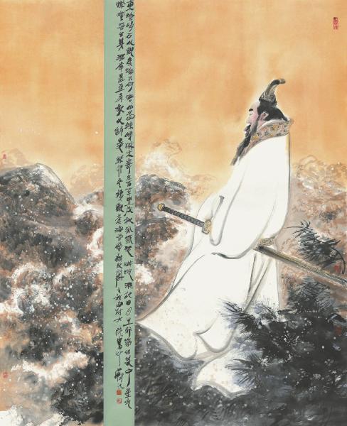 张剑多作人物画,深谙传统水墨的精神趣味,以泼写的方式创变出一种既有传统基础又能推陈出新的富有现代感的人物画法。其现代感,体现在美术视野的宽广有趣,既充分打开了以水墨进行情感表现的巨大空间,又在现代媒材意义上把水墨艺术的语言魅力大大彰显出来,对今天的人物画创作很有启发意义。以这幅《观沧海》为例,艺术家以数笔先行勾勒出人物的面部眉目、耳鼻及须髯,大体面目既出,旋即大笔淋漓、纵横挥洒,将衣纹轮廓等一泻千里、畅快写出,酣畅恣肆。然后加以着色渲染、悉心收拾,作品大功告成,将画中意趣留予观者品评。 (余如波)