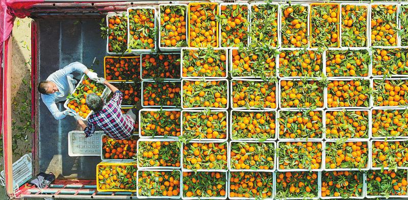 4月8日,在眉山市仁寿县普宁街道镇山社区,果农们正在将柑橘装车(右图)。连日来,随着气温回升,柑橘进入销售旺季,当地通过挂树保鲜,错峰上市,不仅果实能积累更多糖分,还能避开柑橘价格低谷,实现更高收益。 潘帅 摄(C视觉)