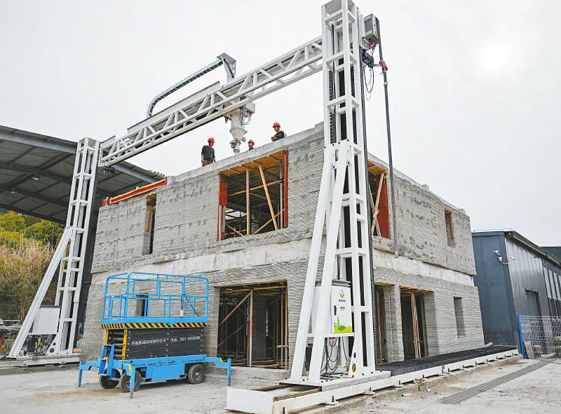 这是4月9日拍摄的3D打印机建设的双层小楼。近日,在湖北宜昌三峡大学3D打印研发基地试验场,一栋由学校自行研发的12米级龙门式建筑3D打印机建设的双层小楼实现封顶,比传统建造工期缩短约70%,打印的效率和完整性达到预期效果。新华社记者 杜子璇 摄