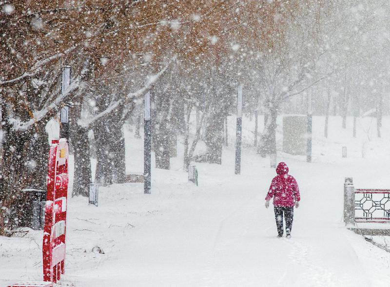 4月12日,在黑龙江省呼玛县,市民在雪中出行。当日,我国北方多地出现大风降温天气。新华社发(褚福超 摄)