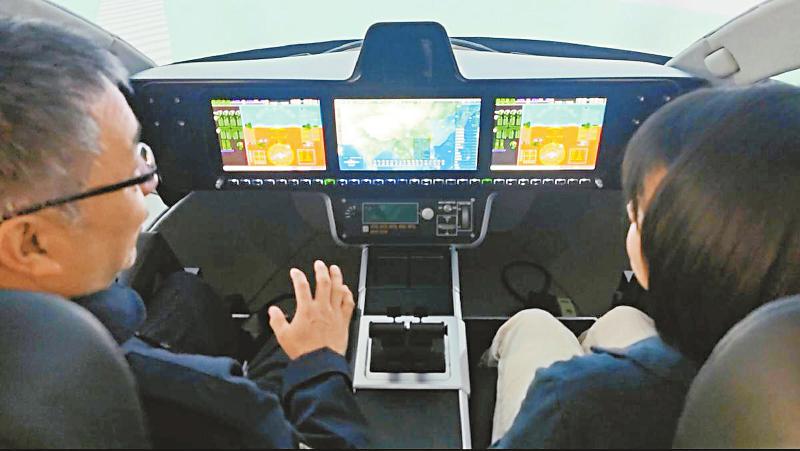 试飞员(左)正在模拟机内体验操作。四川日报全媒体记者 向宇 摄