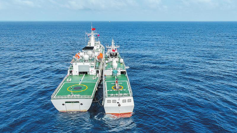 3月21日,在中国黄岩岛附近海域,高栏舰与海警鹤宝舰开展海上燃油补给训练(无人机照片)。