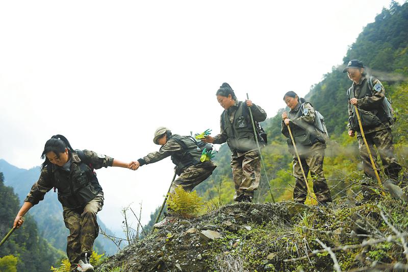 4月28日,巡护队员在汶川县绵虒镇沙排村毛毛沟样线开展巡护。